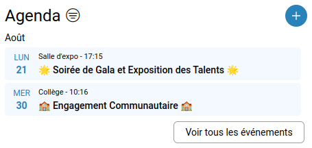 Dans le widget de l’accueil, les évènements de l’agenda d’établissement sont regroupés par mois, et triés du plus ancien au plus récent.