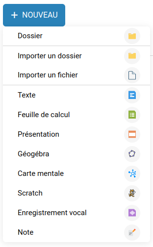 Cliquer sur le bouton Nouveau, ou faire un clic-droit dans le panneau central ouvre le menu de création suivant: