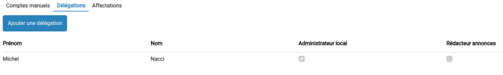 Le service de délégation permet d’accorder 2 permissions: Administrateur local et Rédacteur d’annonces.
