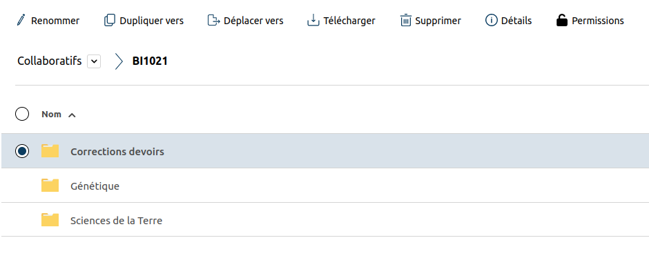 Il est alors possible de définir des permissions par profil. Sur l’exemple ci-dessus, l’enseignant du cours BI1021 veut interdire l’accès du dossier ‘Corrections devoirs’ aux élèves du cours.