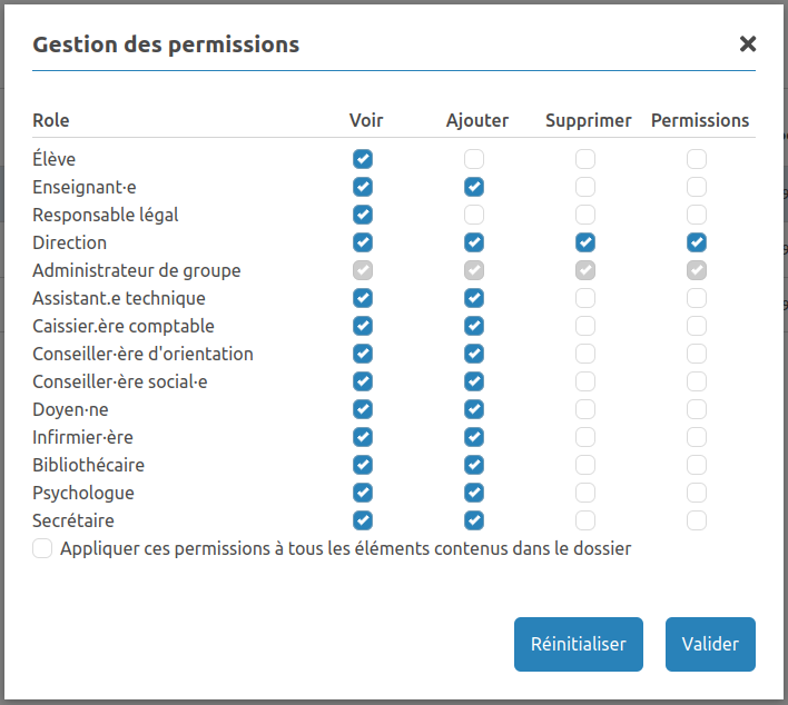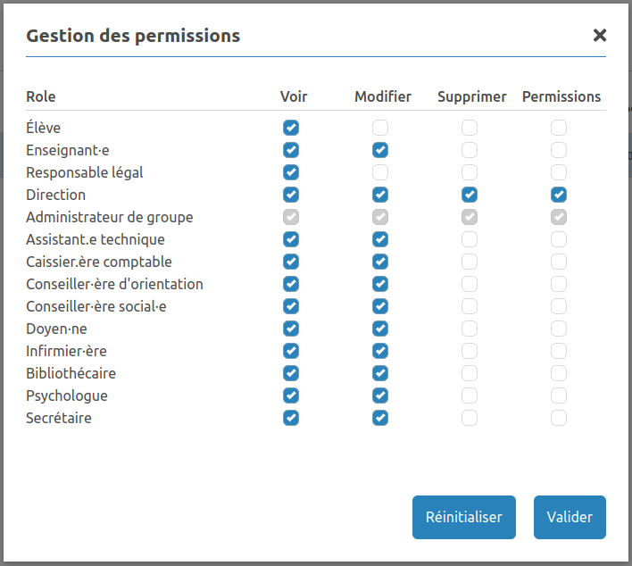 Les permissions grisées sont non modifiables.