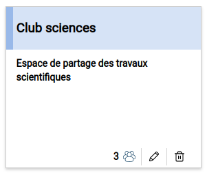 La vignette affiche le titre de l’espace, sa description et le nombre de ses membres. Si l’utilisateur en a la permission, il dispose des boutons pour éditer et supprimer cet espace.