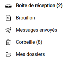Il existe 4 dossiers de messagerie par défaut: Boîte de réception, Brouillons, Envoyés et Corbeille. Le répertoire Mes dossiers permet d’organiser et de classer ses messages. Le dossier ‘Programmés’ est créé à la création du 1er message à envoi différé.