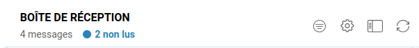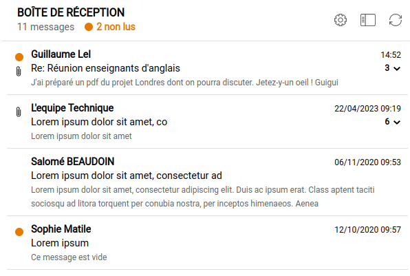 Les messages marqués d’un point de couleur indiquent que le message est non lu. Les messages sont triés par date décroissante.