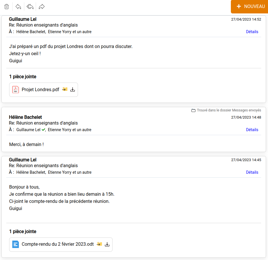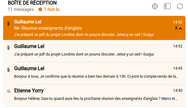 Les messages d’une même discussion (réponses, transferts) sont inclus dans un seul fil de discussion. Lorsqu’un fil de discussion comporte plusieurs messages (le 1er sur l’exemple précédent), alors le nombre de messages est indiqué sur la droite, et cliquer sur le fil déroule les messages du fil, comme ci-dessous.