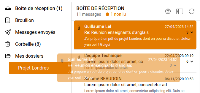 Les dossiers autorisés au déplacement prennent la couleur de thème de l’utilisateur au survol. Relâchez pour déplacer.