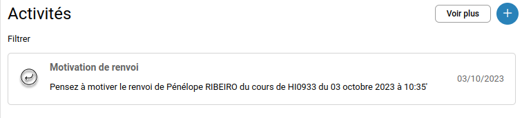 Notez que le doyen et le maître de classe de l’élève renvoyé ont également une nouvelle notification dans le fil d’activité indiquant ce renvoi.