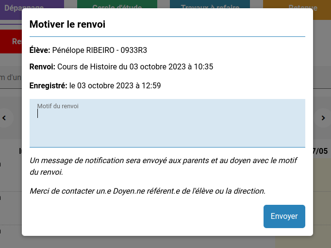 En cliquant sur Envoyer, le maître notifie les parents de l’élève et le doyen du motif du renvoi.
