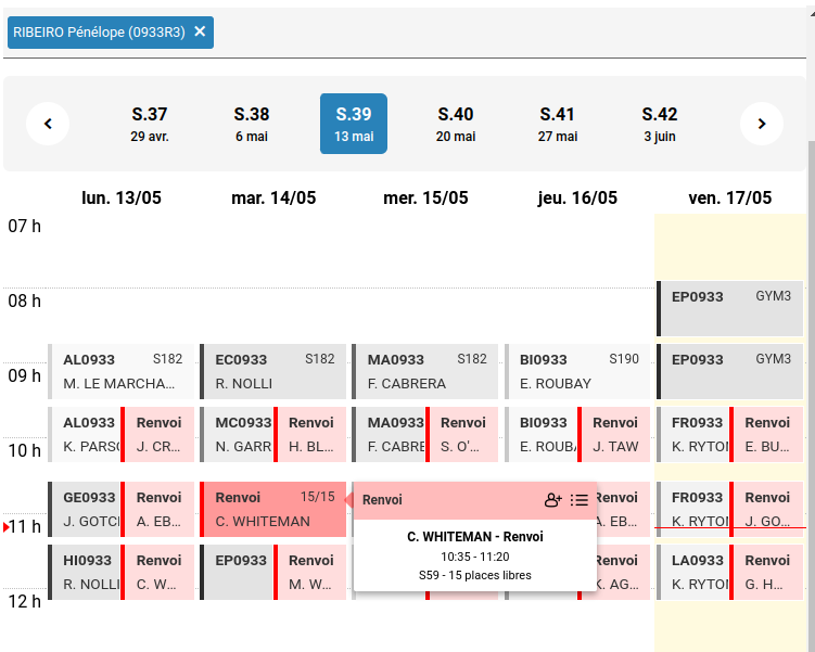 Dans le service des horaires hors cadre, il/elle sélectionne Renvoi puis recherche l’élève renvoyé en tapant les premières lettres de son prénom ou de son nom.
