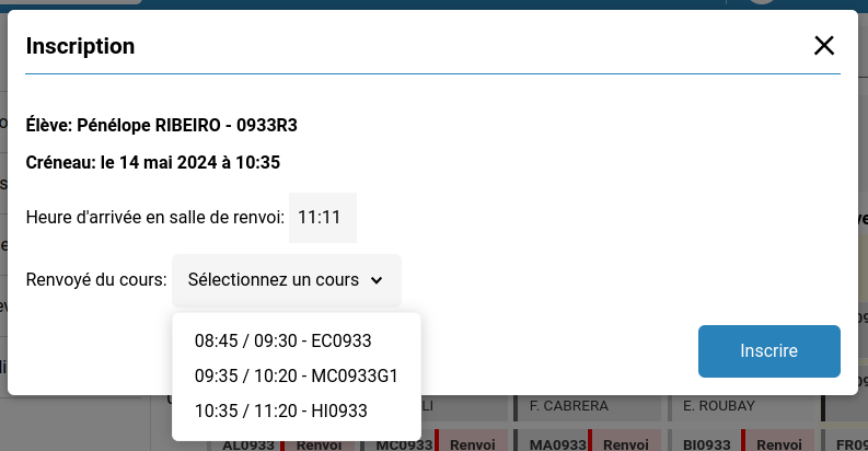 La fenêtre récapitulative s’ouvre, dans laquelle le maître surveillant sélectionne le cours depuis lequel l’élève a été renvoyé.e, par défaut le système propose le ou les cours actuels de l’élève.