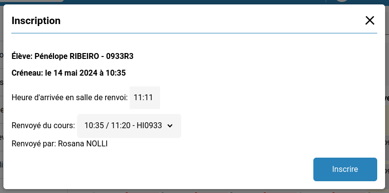 Lorsqu’un élève est renvoyé d’un cours (ou d’un horaire hors cadre), plusieurs profils peuvent procéder à l’inscription de l’élève : le maître surveillant du créneau de renvoi correspondant, le secrétariat, les doyens, la direction.