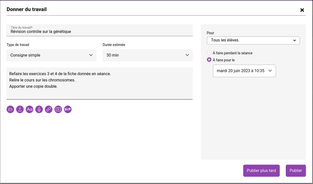- Cliquer sur ‘Publier’ crée le devoir et le rend immédiatement visible pour les élèves.
