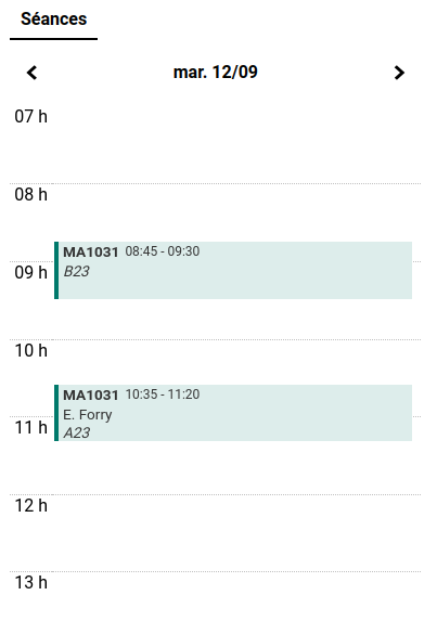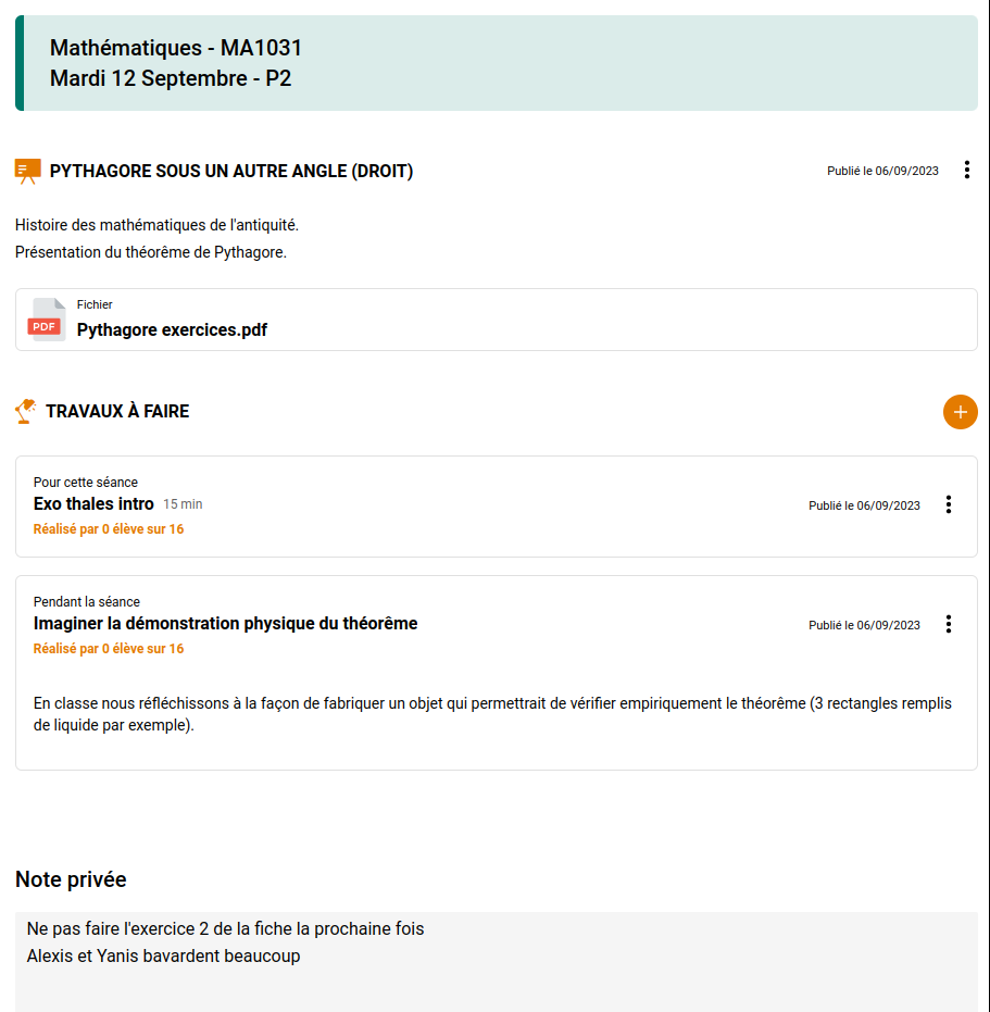 L’onglet ‘Séances’ permet aux enseignants de renseigner leurs supports de cours et de donner des devoirs.